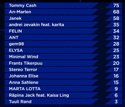 20:18: The super finalists are An-Marlen – Külm, Andrei Zevakin feat. Karita – Ma Ei Tea Sind and Tommy Cash – Espresso Macchiato